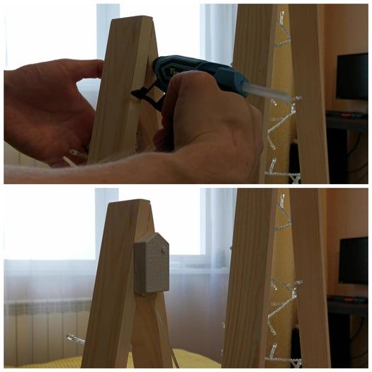 现在开始装饰圣诞树,我挂上了灯串,控制器部分用热熔胶固定了一下。
