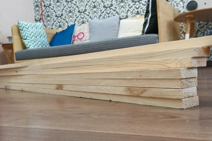 我使用的是1.8*4*150厘米的松木板。整体结构非常简单,只需要做两个三角形,一个大一点,一个小一点。