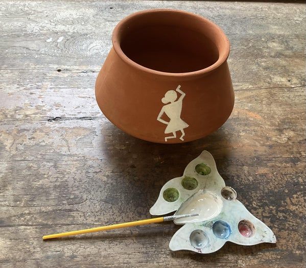虽然早期只限于泥墙和天然材料,但Warli艺术也在不断演变。上世纪70年代,艺术家吉维亚·索玛·马什(Jivya Soma Mashe)让这种艺术形式获得了认可,并开始将其转移到画布、纸张和其他媒介上,比如我这里使用的陶罐。如今的Warli艺术家们大多使用现成的颜料和画笔,这不仅保留了传统风格,也让作品更加灵活多样。这种现代表达方式让更多人能够欣赏到Warli文化的美丽与故事,同时又不失去其古老根源。