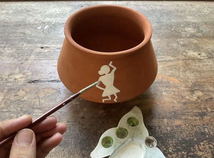 就像Warli艺术家们在泥墙上作画前需要先处理墙面一样,我也必须处理陶罐表面,确保颜料能很好地附着,并且表面干净。