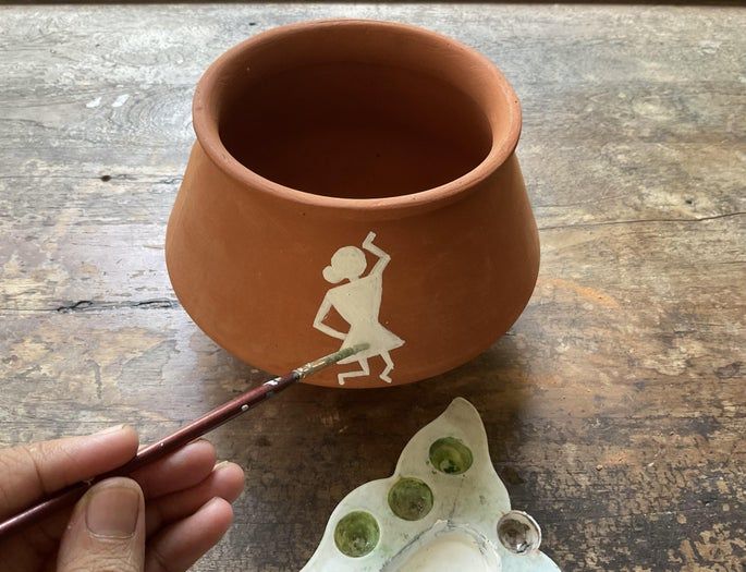 现在是最具标志性的部分——绘制Warli人物!这些都是由简单几何形状组成的。我使用普通的白色丙烯颜料和细头画笔,就像当代Warli艺术家那样,直接在处理好的陶土表面作画,让陶土原本的颜色作为背景。每一笔都像是一个记忆在成型。