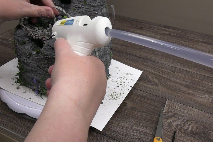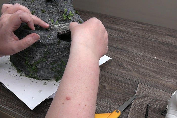 使用Original Sculpey烘烤粘土塑形六块小桥板。待形状固定后,用牙科探针刻划木板纹路。接着将铁丝衣架剪至合适长度,确保部分可插入喷泉底座,其余部分用于塑造立柱。将粘土包裹铁丝后,再次用牙科工具刻划纹理。
