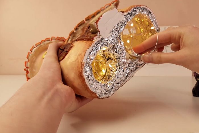 首先在储物柜寻找旧玻璃罐或在超市选购实惠的罐子。使用热熔胶将罐体与金属箔粘合后,即可开始用硬纸板制作屋顶。