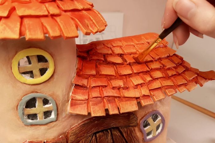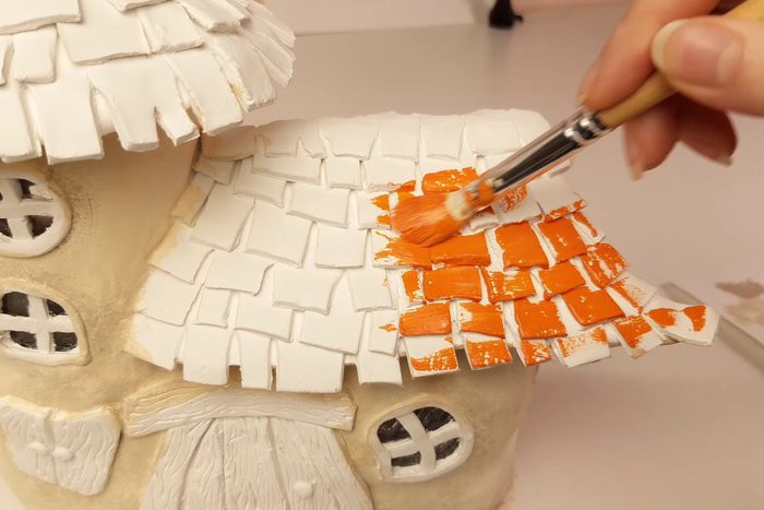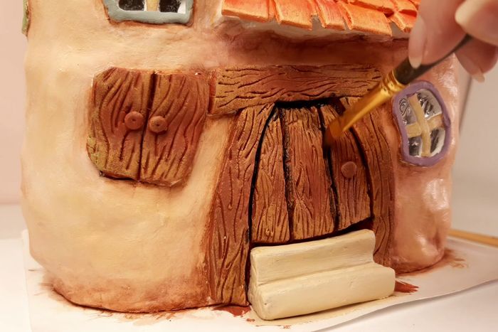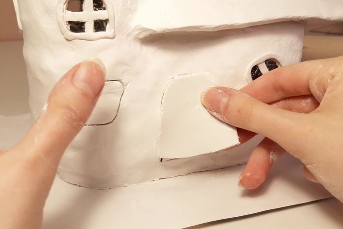 切割门窗造型并叠加粘土层。瓦片建议采用自下而上的错位铺贴法,单片逐层排列比整行铺设更能呈现自然质感。