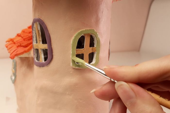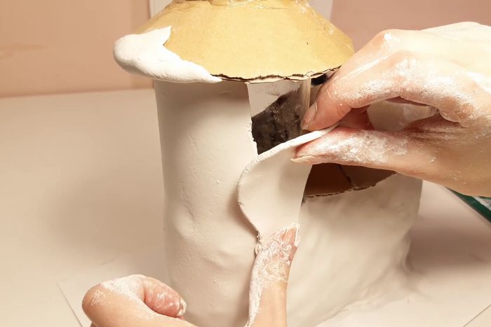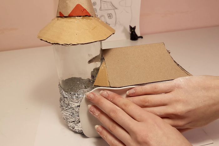 开始塑造粘土层。建议选用免烘烤的空气硬化造型粘土或普通纸粘土。覆盖建筑时确保粘土与玻璃罐间无空隙,特别注意填补屋顶与罐体连接处。
