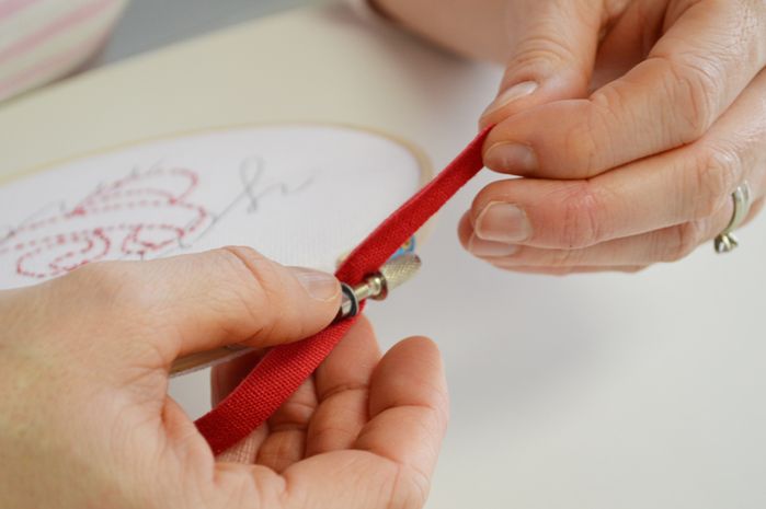 剪一段约50厘米长的刺绣线开始缝制。每次工作时这个长度比较合适。我们将红色和粉色的刺绣线混合在一起,通过分开线束实现。每根线由六根细线组成,因此可以从每种颜色中各取一根。组合好线后,将针穿过线并折叠成两半,在末端打结。