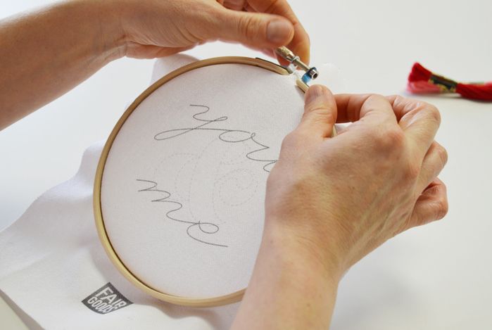 将刺绣框对准模板上淡淡的圆圈位置。拉紧布料的同时拧紧螺丝,布料越紧越好。