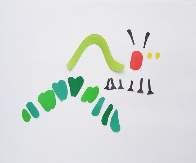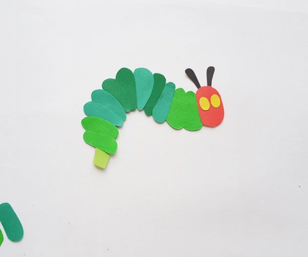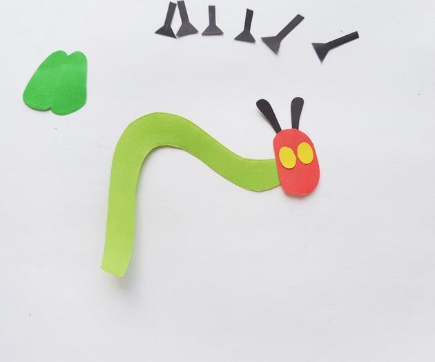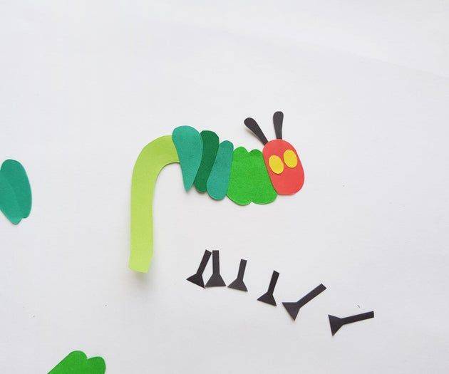 当所有身体部分都粘好之后,接下来就可以将脚部剪纸沿着毛毛虫底部粘贴上去。