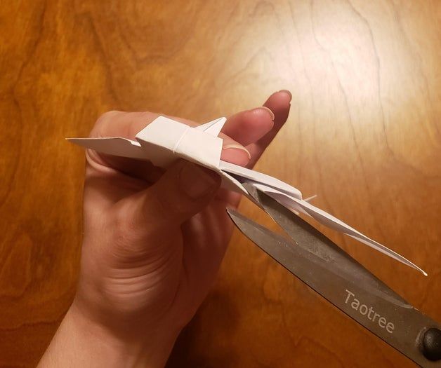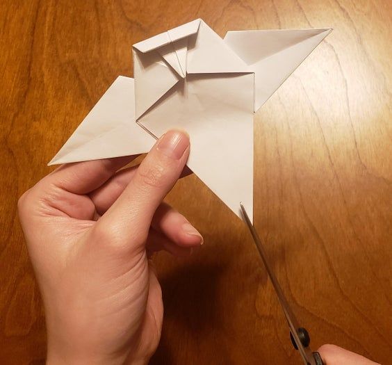 要做脚的部分,在底部角的中心位置剪一个小口子,但注意只剪上层纸。然后把剪出来的纸片往上、往外折。