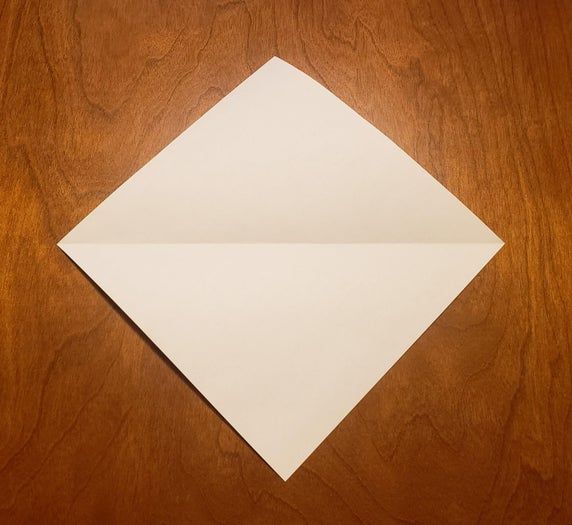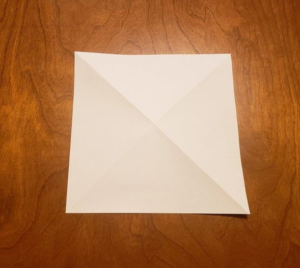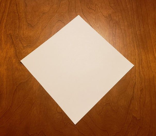 先把纸稍微旋转一下,让它看起来像个菱形。接着把纸对角线对折一次再展开,然后换另一个方向重复同样的动作。