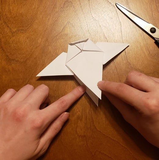 要做耳朵的部分,先把模型翻个面,确保所有纸片都平整地铺开,在上层纸上剪两个小口子,就像图里那样。然后再翻回来,把耳朵部分往前折出来。