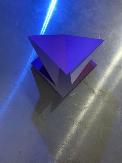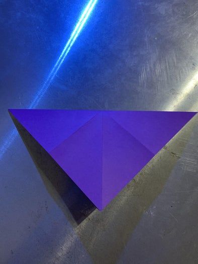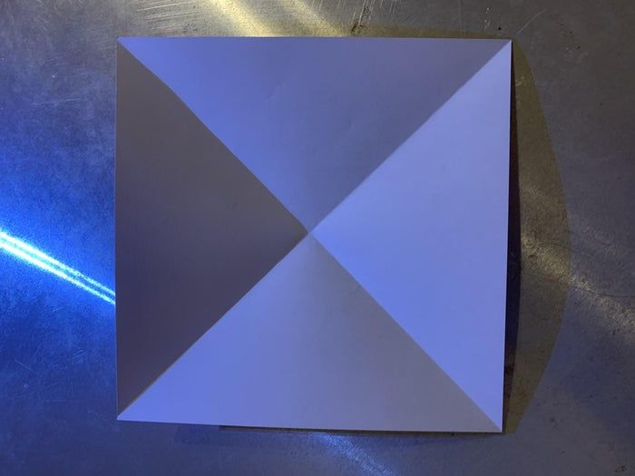 - 把纸有颜色的一面朝下放好,沿着两条对角线分别做一次谷折