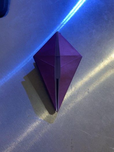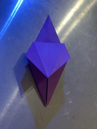 - 将模型顶部边缘向下折,使其与三角形折痕底部对齐。再将上半部分做压扁折叠,形成一个“菱形”