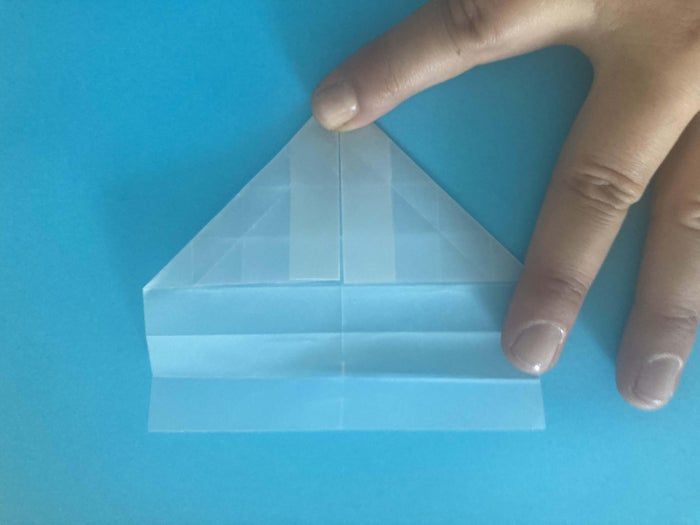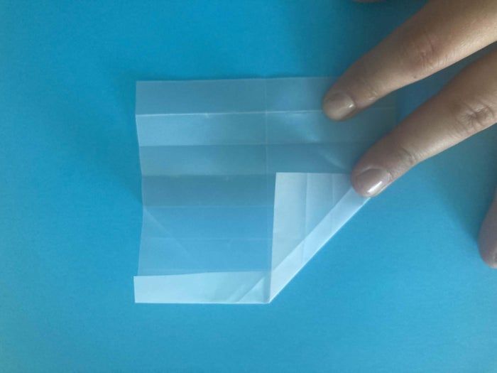 将其中一个角沿着折痕向下折到第三条线上,另一边也做同样的操作。