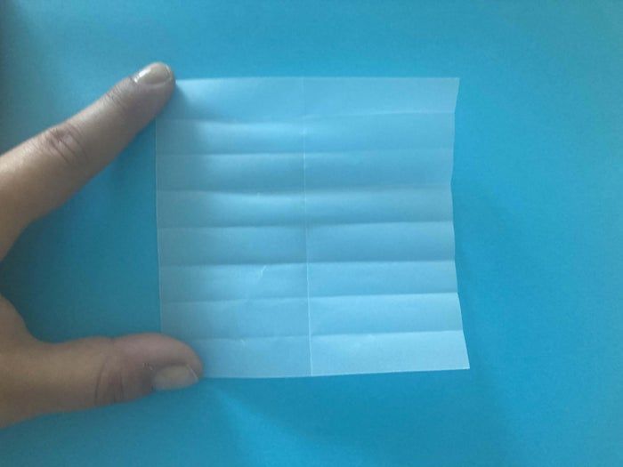 翻转一下纸张,再把另一半也继续对折一次。现在你应该能看到横向有七道折痕,纵向有一道折痕。