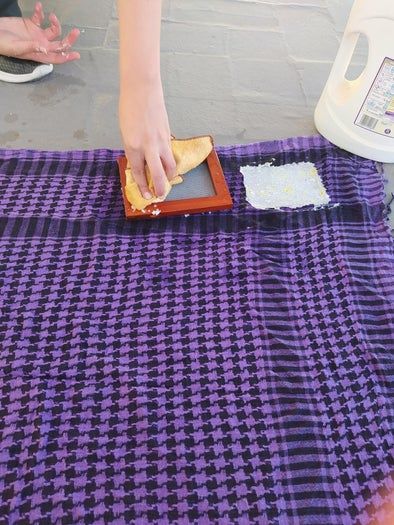 照着图操作就很简单啦!颜料要搅匀,把做好的纸浆框子浸到水里,稍微沥一下水,然后翻面贴到布上。用布或者海绵轻轻按压,挤出多余的水分,接着取下相框就行了。