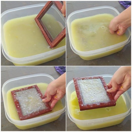 在更大的容器里多加点雨水,然后用手抓一些搅拌好的纸浆放进去。如果不想频繁换水的话,可以先把黄色颜料加进去,充分搅拌至完全溶解。