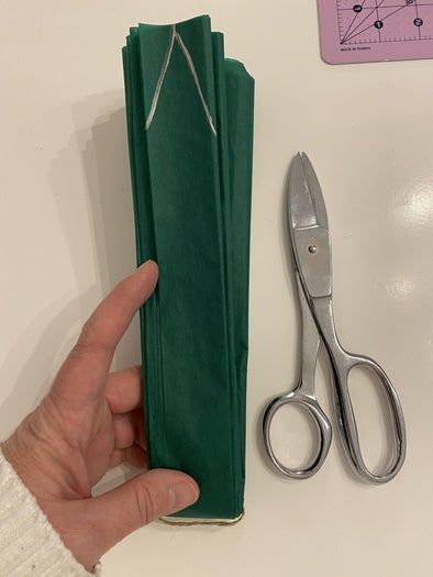 现在,拿起你的剪刀,给两端剪出尖角或者圆角。这一步如果剪刀不够锋利的话会有点难操作。如果你觉得纸太厚不好剪,可以回到前一步骤,在绑之前少用几张纸先剪好尖角,然后再重新叠上10张一起绑起来。