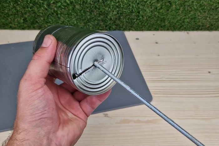 第一步是准备罐头。先把罐头上的标签撕掉,然后彻底清洗干净。在罐头封闭的一端钻两个8毫米的孔,一个正好在中间,另一个在侧面。接着在这两个孔之间画一条线,并用磨轮沿着线切开。
