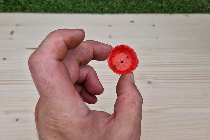 第二步是准备饮料瓶。无论你用什么品牌的瓶子都可以,只要直径比罐头稍微大一点就行。下一步我们会用到瓶盖。用美工刀从瓶子底部切下10厘米长的一段。把它套在罐头上,然后用热风枪加热塑料,让瓶子紧紧贴合罐头。接着在瓶子上切三个口,这样可以方便地将它从罐头上取下来再装回去。最后,在这一步中,在瓶子底部的正中间钻一个8毫米的孔。