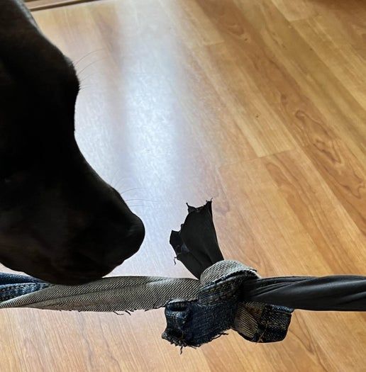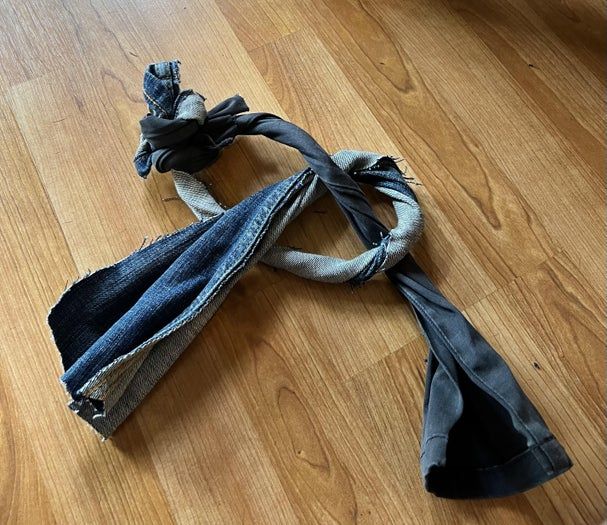 我家狗狗没有玩具玩的时候总是闷闷不乐。于是我用我旧牛仔裤重新改造,给她做了一个耐用的狗玩具!