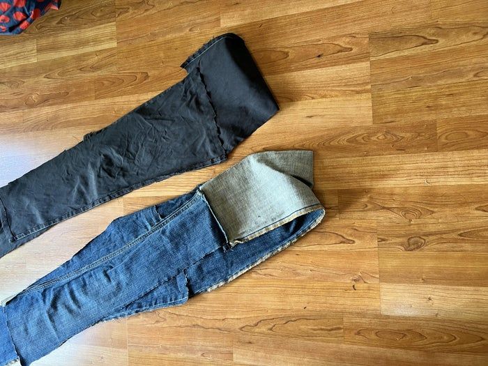 - 在牛仔裤最宽的地方剪开,做成两条长条(每条裤腿各取两条)