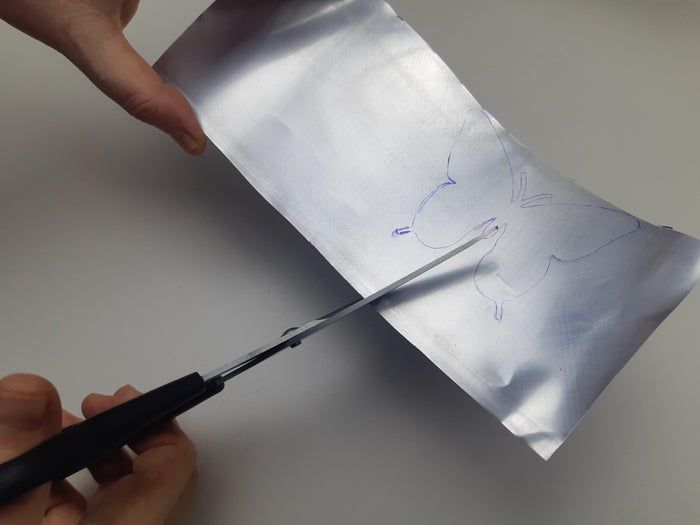 在剪下来的铝片上放上刚才剪好的纸蝴蝶模板,然后用笔或铅笔描出轮廓。