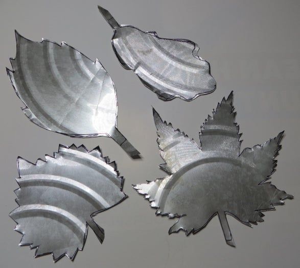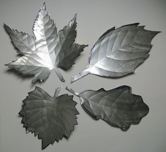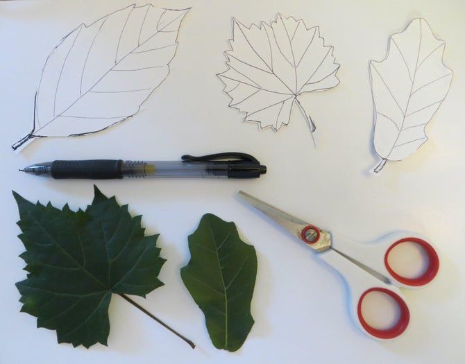 我从院子里挑选了各种叶子当作模板,在硬纸板上将它们的轮廓描下来。注意,叶子的宽度不要超过11.4厘米,这样你可以在一个饼盘上放下四片叶子。