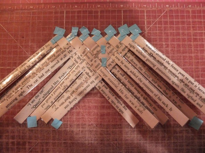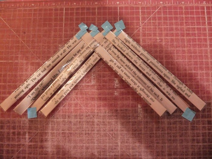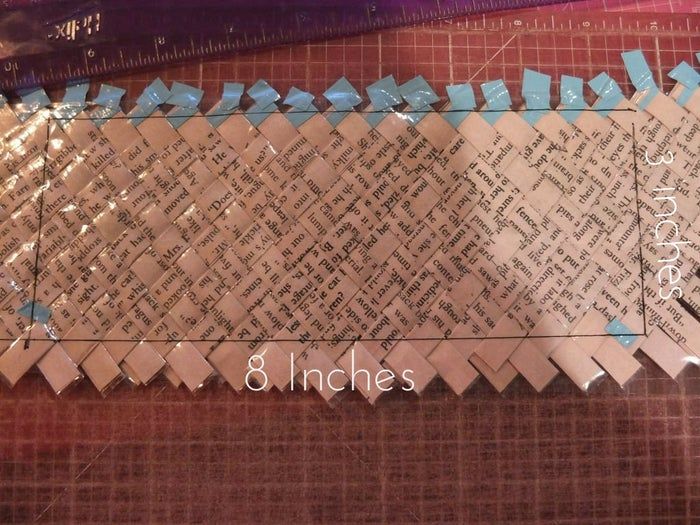 开始编织时,先用胶带把一组条带固定在切割垫上。再把另一组条带依次排列好。完成后,将交叉的条带编织在一起。