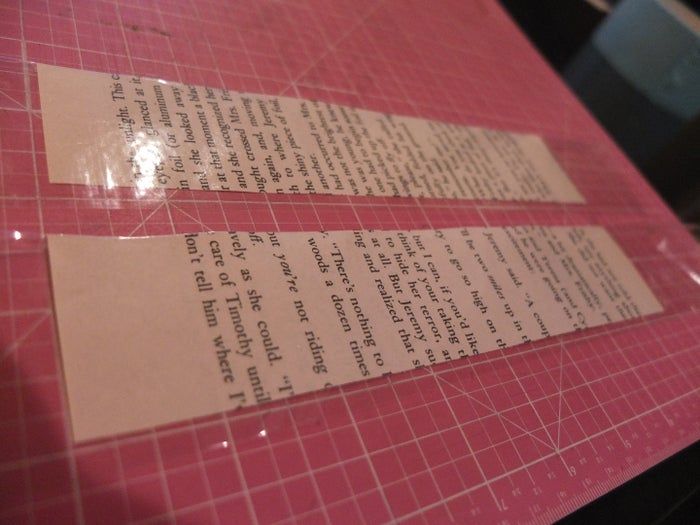 接下来制作口袋。我切了一些7.5厘米×3.8厘米的条带,用胶带覆盖其中一面,然后用它来固定到钱包上。