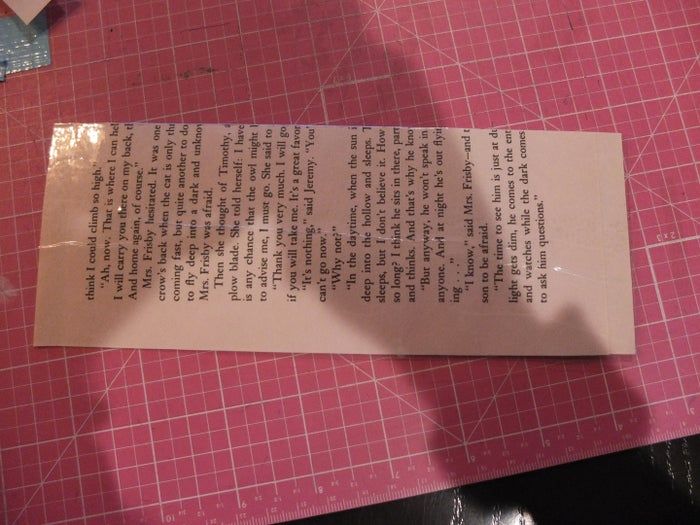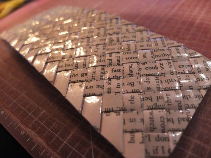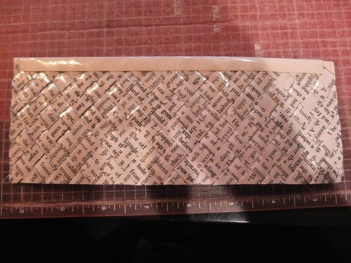编织完成后,用透明胶带固定其中一边。然后修剪边缘,使它变成8厘米×3厘米大小。之后我又加了装饰边条。我切了一条7.5厘米×1.9厘米的装饰条,对折后用胶带固定在边缘。