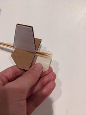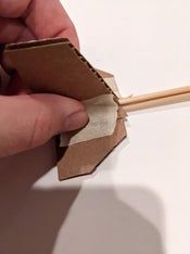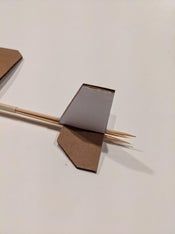 现在把纸板做的机翼套到竹签上,有斜角的一面朝后。接着从竹签尖头那端开始量出12.7厘米,在这个位置用记号笔做个标记,然后缠上三四圈美纹纸胶带,这样就能把机翼固定住了(防止滑动)。