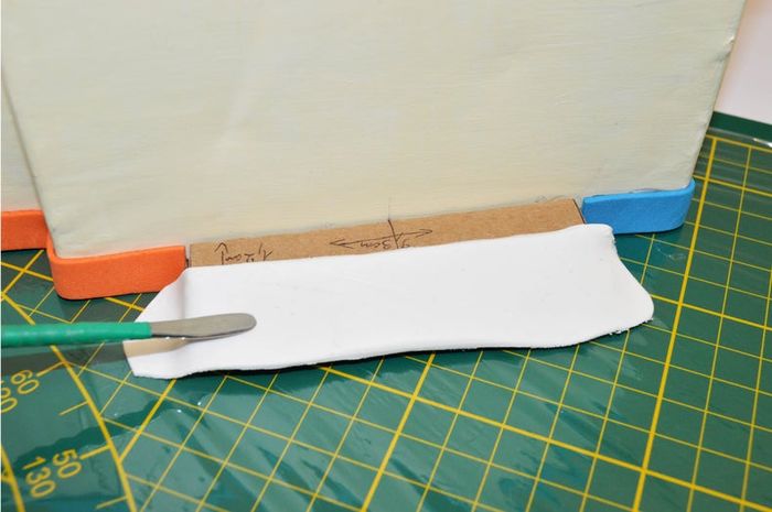 你需要剪两块手工泡棉板,分别用来做房子顶部和底部的装饰线。可以用热熔胶粘上去,再用纸黏土覆盖。