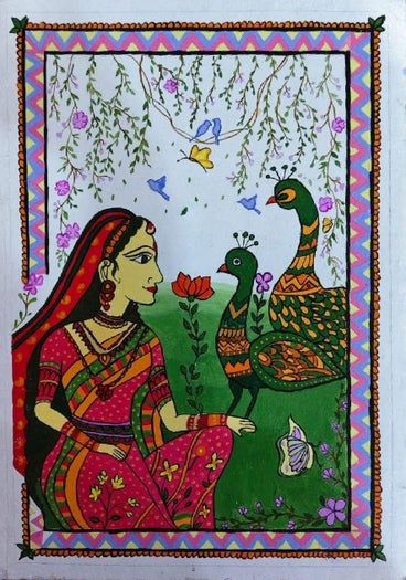 马杜巴尼画也被称为米提拉艺术,起源于比哈尔邦的米提拉地区,历史可追溯至公元8或9世纪,一些学者甚至认为它的历史更为久远,在《罗摩衍那》中就有提及。马杜巴尼艺术以几何图案为特色,常见的象征性图案包括鱼、孔雀、生命之树和神灵形象等。