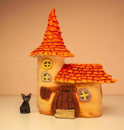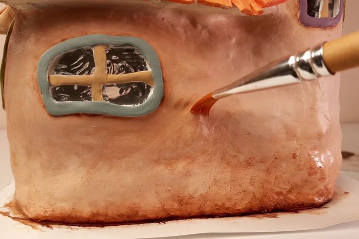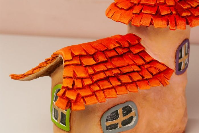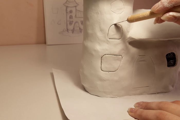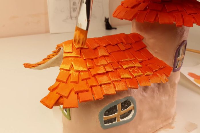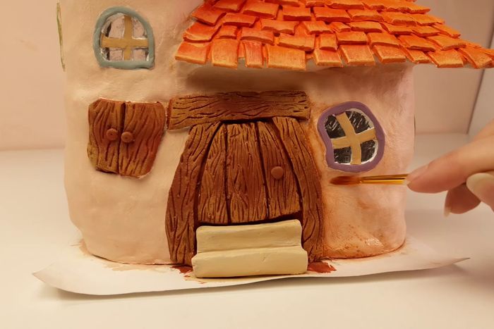 切割门窗造型并叠加粘土层。瓦片建议采用自下而上的错位铺贴法,单片逐层排列比整行铺设更能呈现自然质感。