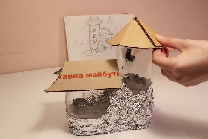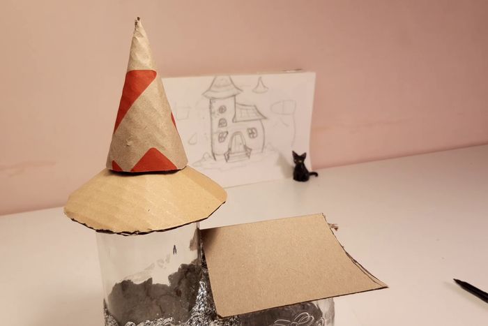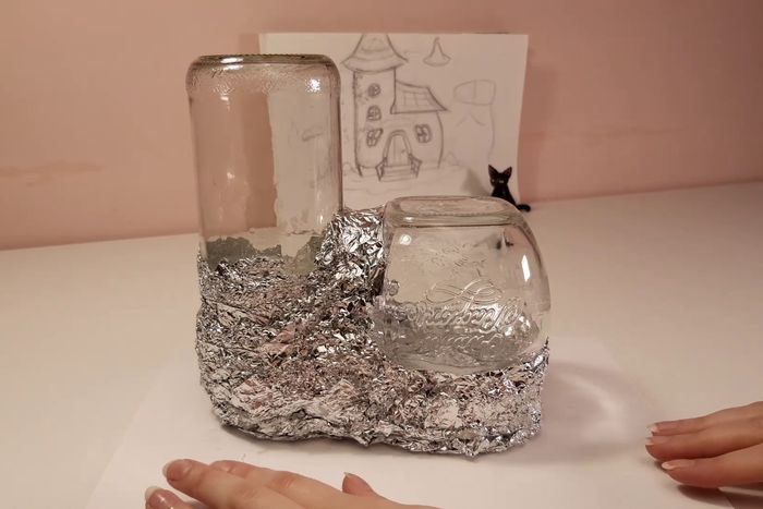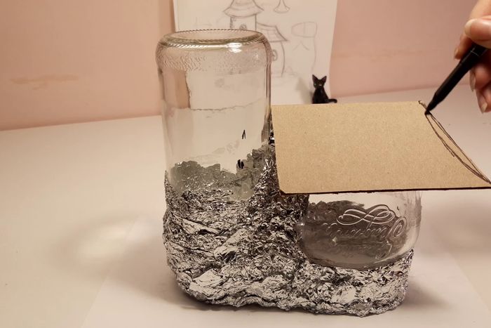 首先在储物柜寻找旧玻璃罐或在超市选购实惠的罐子。使用热熔胶将罐体与金属箔粘合后,即可开始用硬纸板制作屋顶。