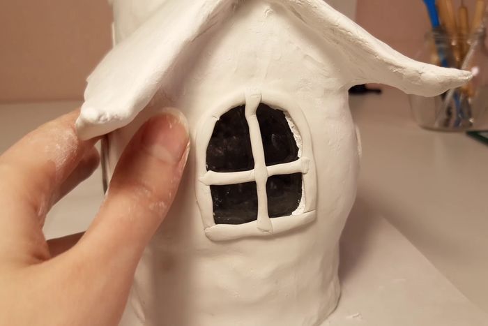 开始塑造粘土层。建议选用免烘烤的空气硬化造型粘土或普通纸粘土。覆盖建筑时确保粘土与玻璃罐间无空隙,特别注意填补屋顶与罐体连接处。