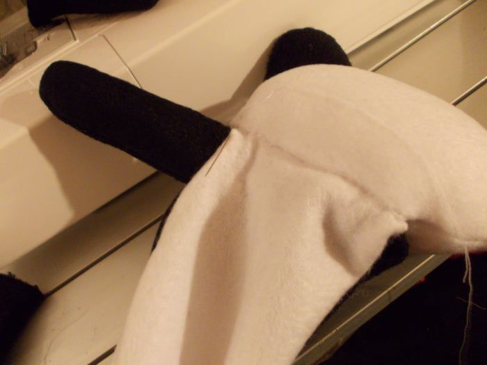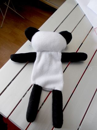 绕着整个熊猫缝制,记得在每个四肢开口的两侧锁住针脚。