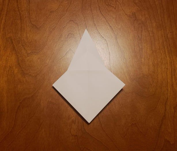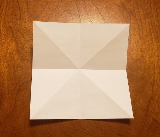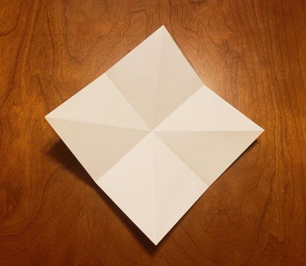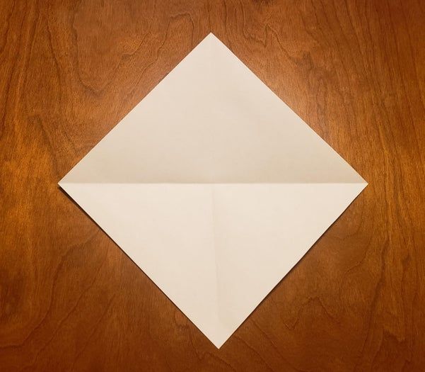 先把纸稍微旋转一下,让它看起来像个菱形。接着把纸对角线对折一次再展开,然后换另一个方向重复同样的动作。