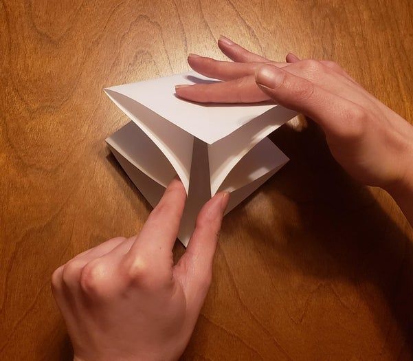 提起底部角的上层纸片,在向内推压两侧的同时,把这个角拉到上面来,然后压平模型并折出痕迹。
