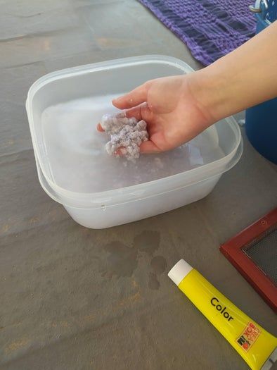 在更大的容器里多加点雨水,然后用手抓一些搅拌好的纸浆放进去。如果不想频繁换水的话,可以先把黄色颜料加进去,充分搅拌至完全溶解。