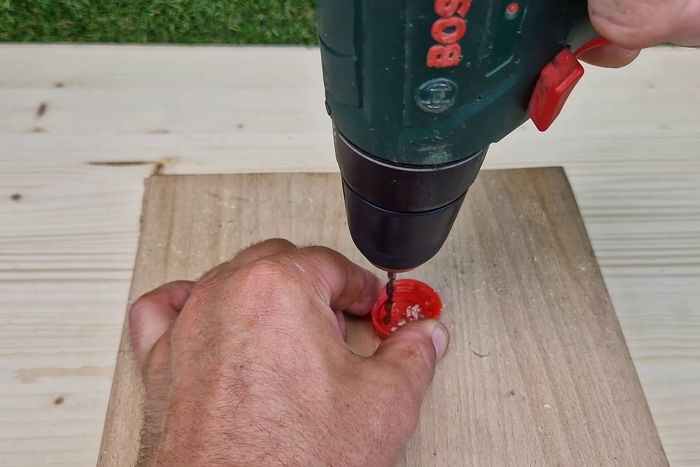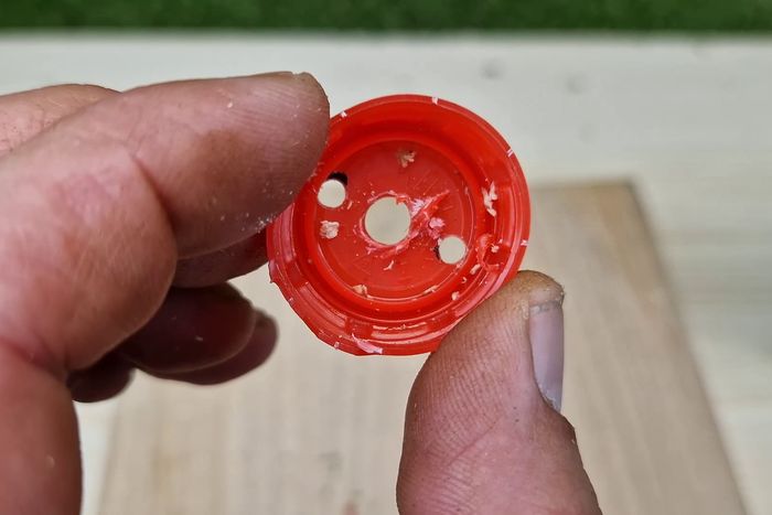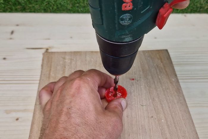 在瓶盖上钻3个2毫米的孔,中间的孔扩大到8毫米,使螺纹杆能穿过。在外侧的两个孔中各拧入一颗短螺丝钉。用美工刀在瓶盖的一侧切一小块,让螺纹杆能平整地放在瓶盖内。最后用热熔胶固定整个装置。