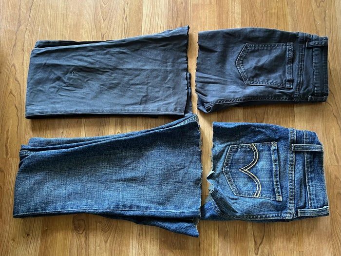 - 在牛仔裤最宽的地方剪开,做成两条长条(每条裤腿各取两条)
