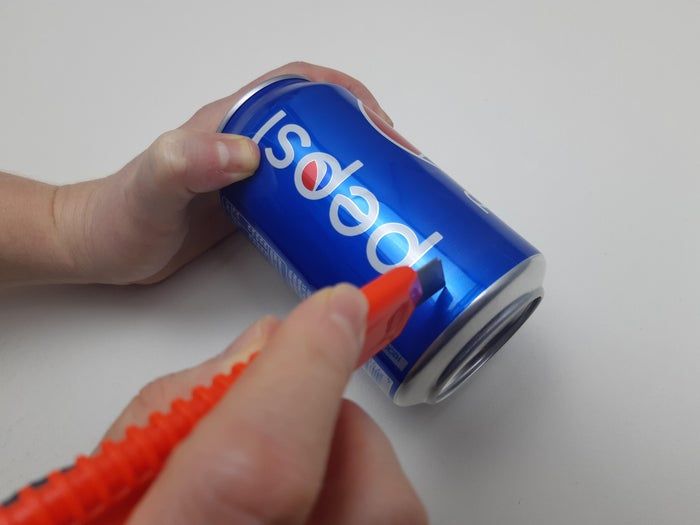 接下来,我们准备铝罐材料。用尖刀在罐子边缘戳几个洞,然后小心地用剪刀剪出一条铝片。