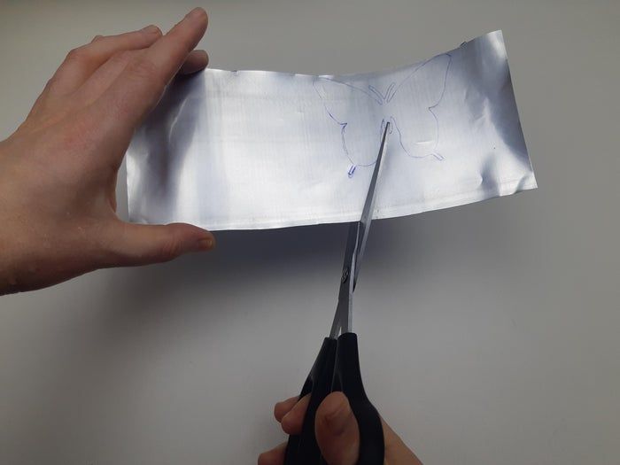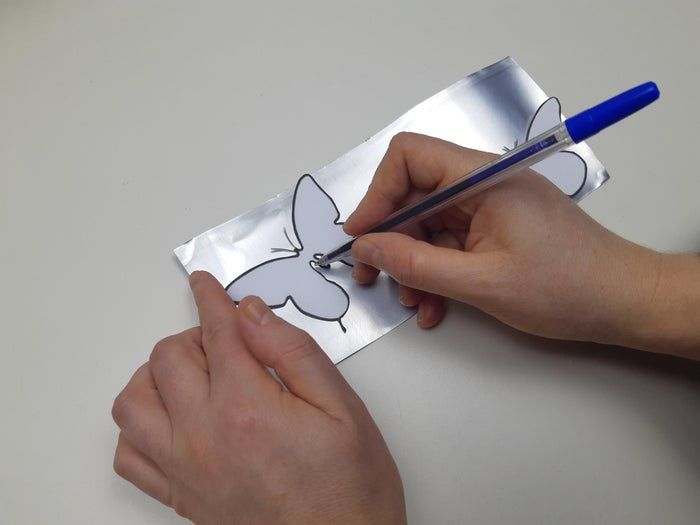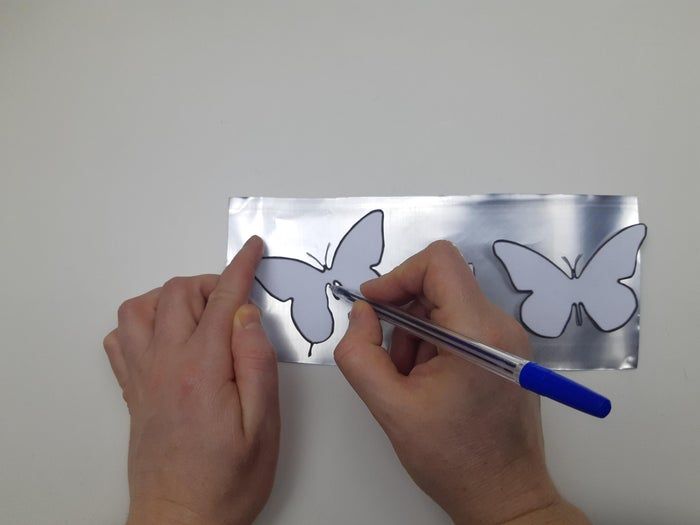 在剪下来的铝片上放上刚才剪好的纸蝴蝶模板,然后用笔或铅笔描出轮廓。