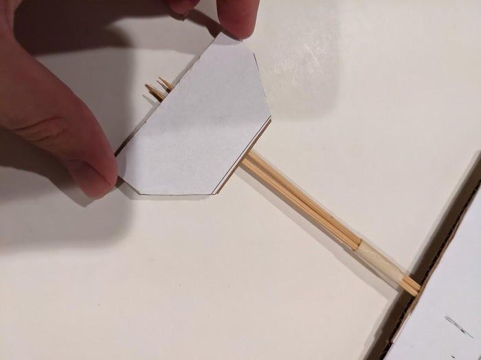 接下来按照和安装机翼一样的方法装上尾翼。底部的水平尾翼穿过下面两根竹签,垂直尾翼则穿过上面那根竹签。