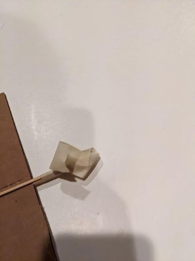 现在把纸板做的机翼套到竹签上,有斜角的一面朝后。接着从竹签尖头那端开始量出12.7厘米,在这个位置用记号笔做个标记,然后缠上三四圈美纹纸胶带,这样就能把机翼固定住了(防止滑动)。