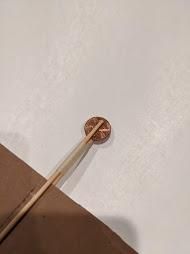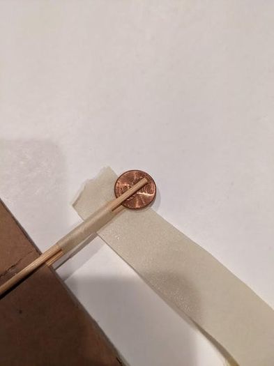 现在把那枚硬币用美纹纸胶带固定在飞机前面。最好把它夹在两根竹签之间,这样更稳。
