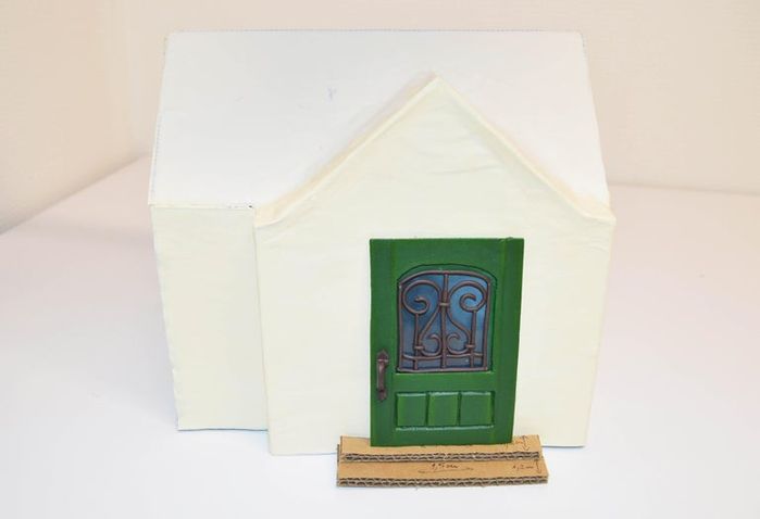 你可以像图中那样把纸板弯折一下,再粘到房子正面上。